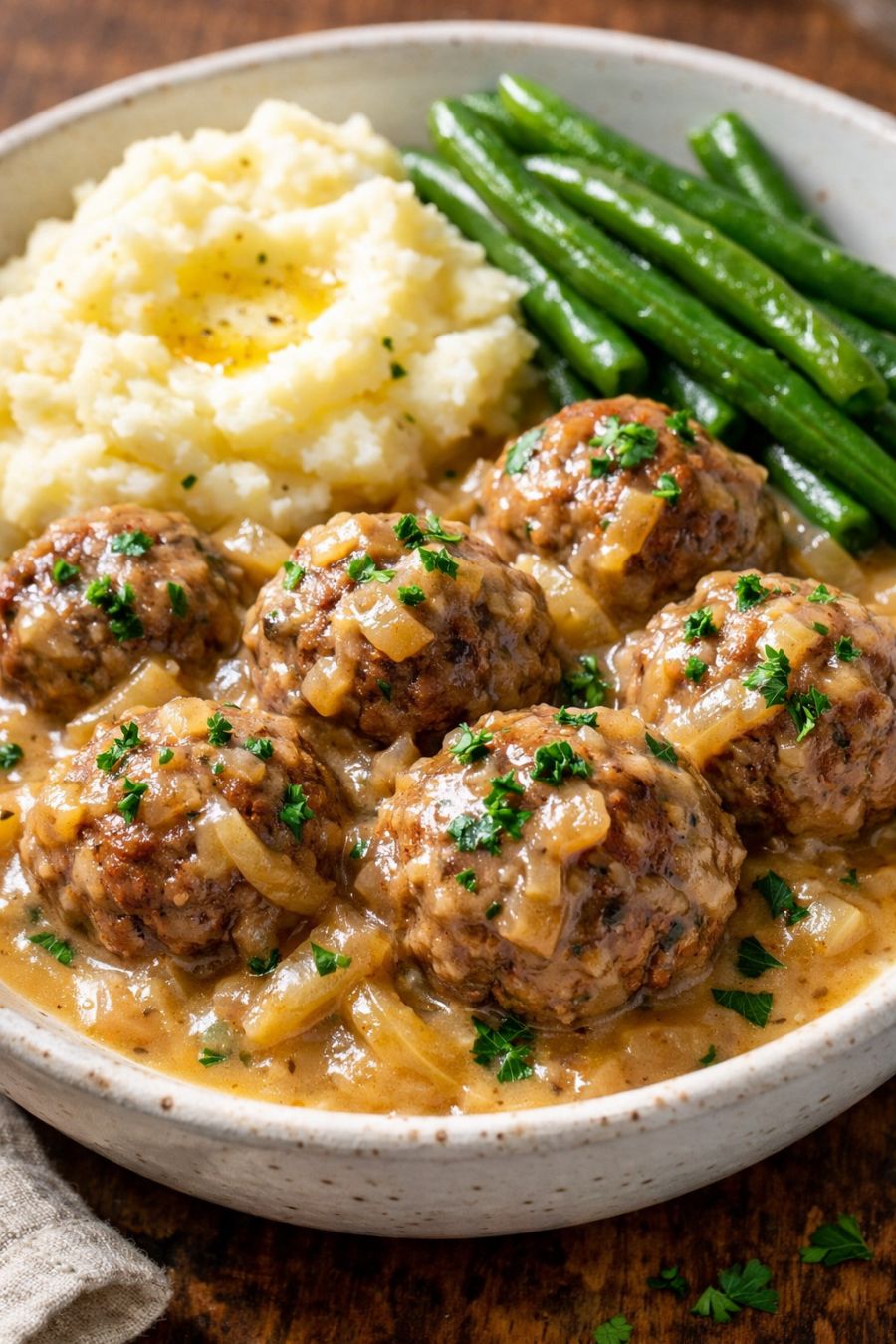 Serve these slow cooker beef meatballs right in their creamy onion gravy over buttery mashed potatoes, egg noodles, or steamed white rice so all that sauce has something to soak into. A bright green vegetable—like roasted asparagus, green beans with a squeeze of lemon, or a simple mixed salad—keeps the plate balanced. For a holiday table, add soft dinner rolls to mop up the extra gravy and round things out with a fruit salad or glazed carrots for a bit of color and sweetness.