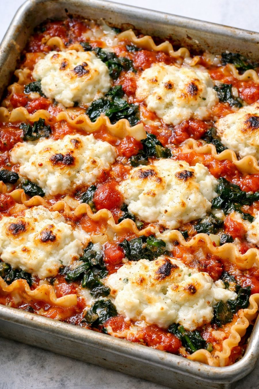 This oven baked 3-ingredients sheet pan spinach ricotta lasagna is exactly the kind of shortcut dinner my Italian mother-in-law swears by on busy nights. She showed me how you can skip all the fussy layering and still get those crispy wavy pasta edges, creamy ricotta, and bubbling tomato sauce in one big pan. Everything bakes together on a rimmed metal sheet pan, so it cooks faster than a deep-dish lasagna and is easy to slice into squares for the whole family. With just lasagna noodles, jarred tomato basil sauce, and ricotta mixed with frozen spinach, it’s a practical, comforting weeknight meal that tastes like you spent way more time on it than you actually did.