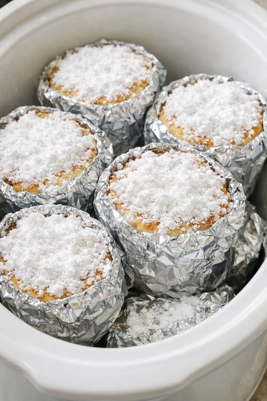 Lightly sift additional powdered sugar over the tops of the warm cakes right in their foil pouches. Close the lid of the slow cooker again for a couple of minutes if you’d like the sugar to melt just slightly into the tops, or serve immediately so the sugar stays visible and pretty.