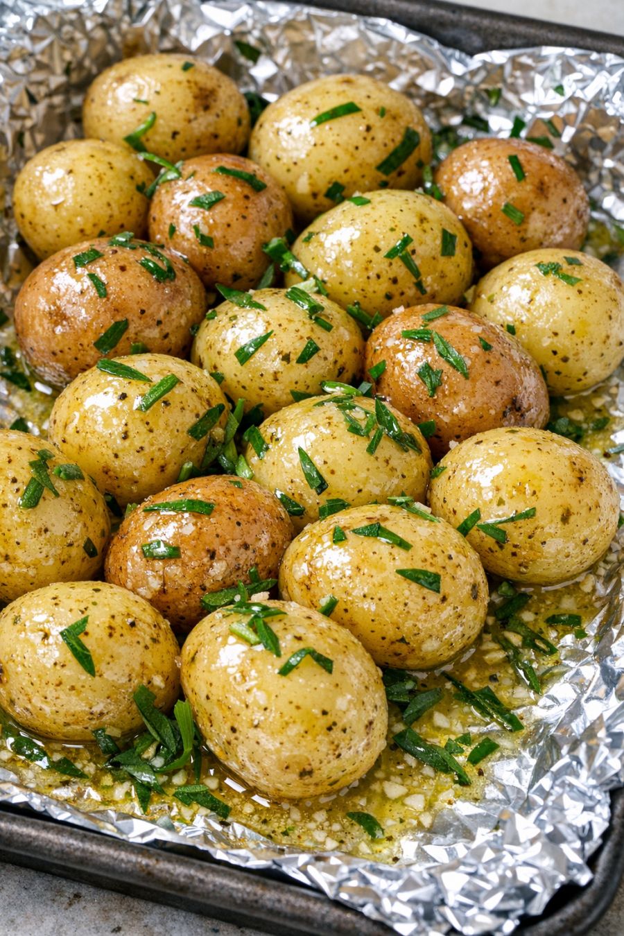 Spread the potatoes out in a single layer on the foil-lined baking sheet, making sure they’re not piled on top of each other. Pour any butter and tarragon left in the bowl over the top.