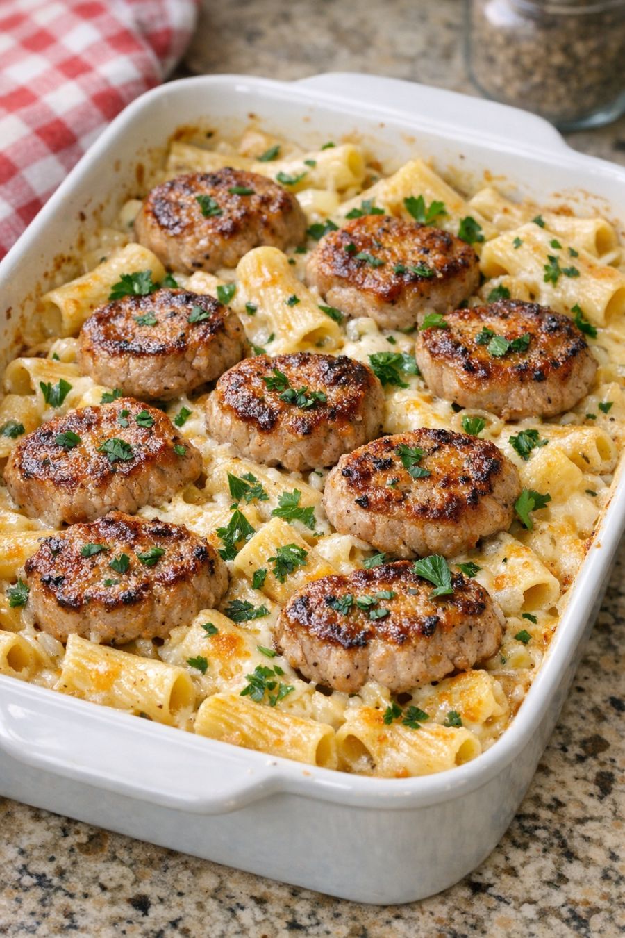Serve this pork medallion pasta straight from the baking dish with a big green salad or some steamed broccoli to balance the richness. Warm dinner rolls or buttered bread are great for soaking up the creamy sauce at the bottom of the pan. A simple side of applesauce or sliced fresh apples fits that Amish-style comfort feel and is usually a hit with kids. If you like a little brightness, squeeze a wedge of lemon over your portion or add a sprinkle of fresh parsley right before serving.