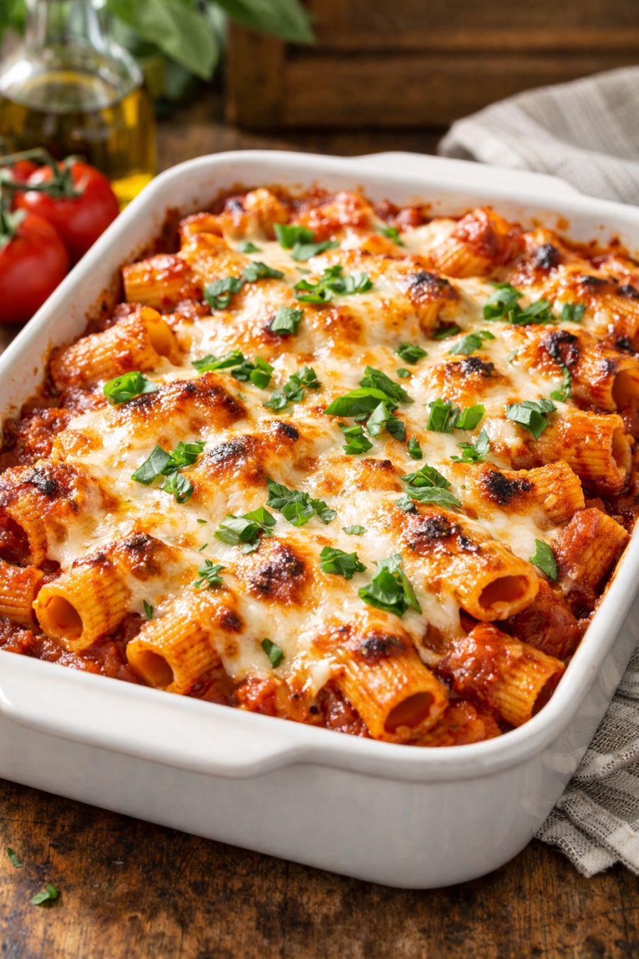 Let the baked rigatoni rest for 5–10 minutes before serving so it can set up a bit and won’t slide all over the plate. Scoop into bowls or onto plates and serve warm.