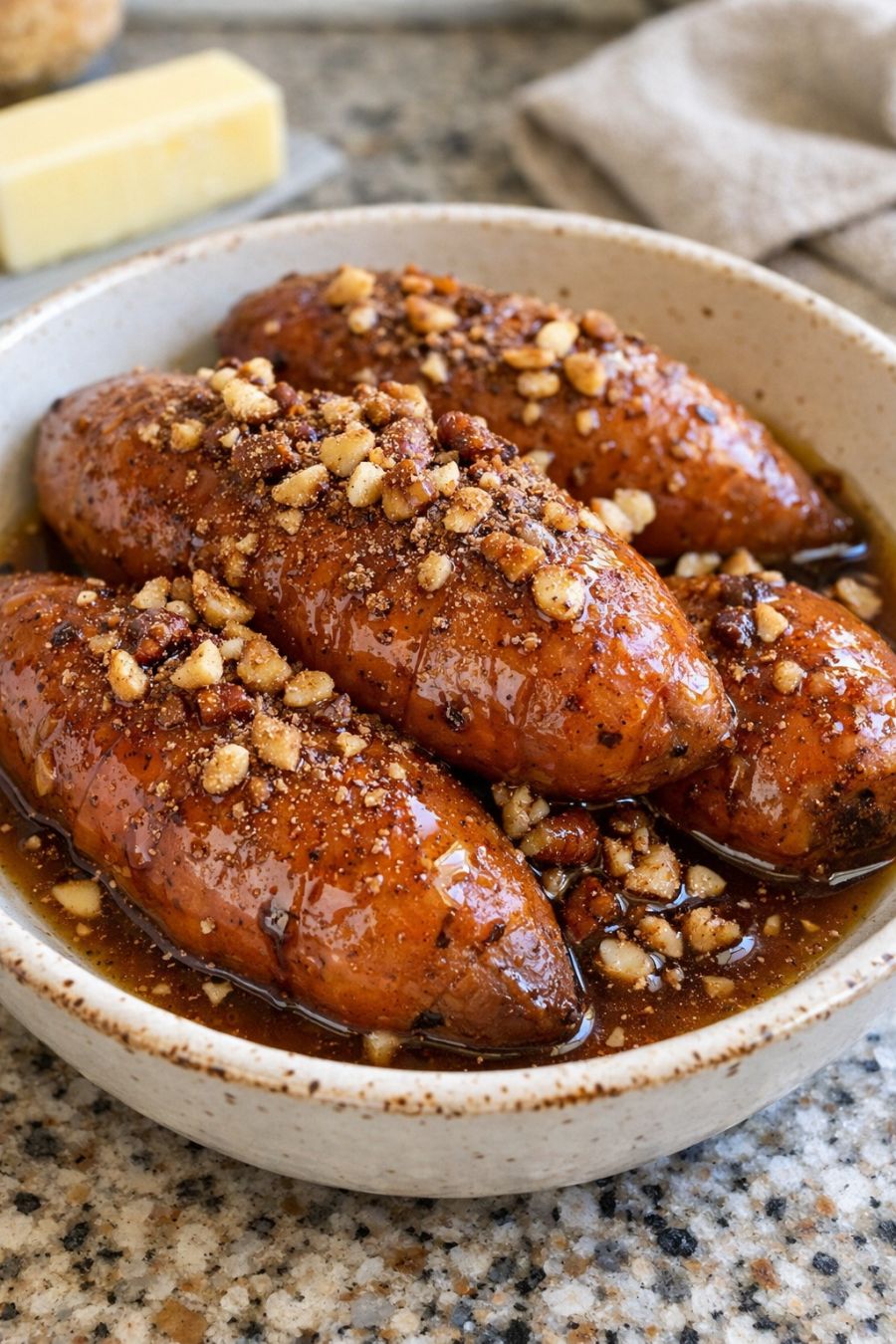 Serve the sweet potatoes hot, split open in a shallow bowl, and spoon the buttery brown sugar sauce from the bottom of the slow cooker over the top. Add a dollop of vanilla yogurt or a scoop of ice cream if you want it extra dessert-y, or keep it lighter with a drizzle of milk or cream and a sprinkle of chopped nuts.
