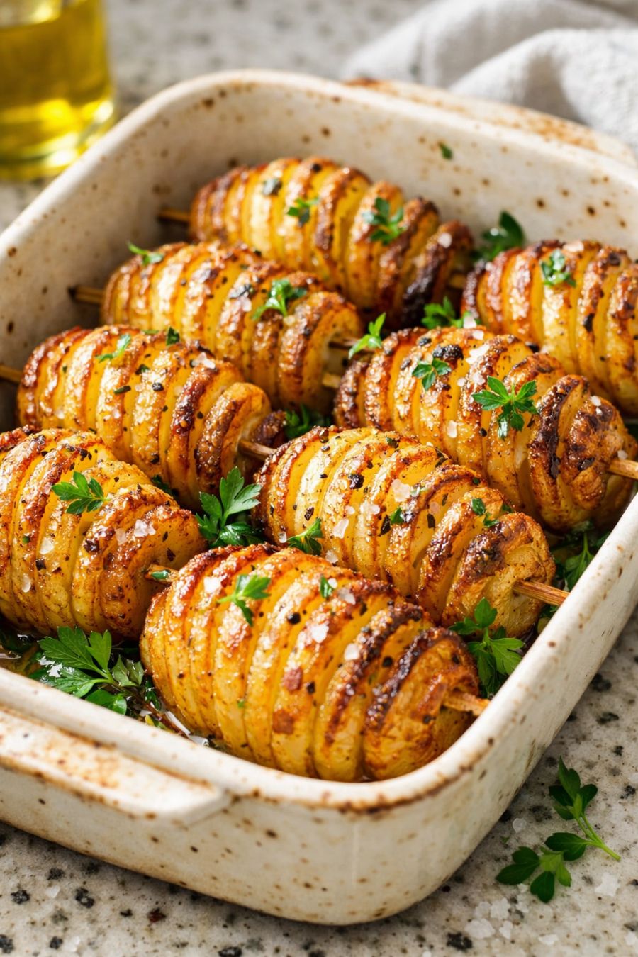 Serve these spiral potatoes hot, straight from the ceramic baking dish, with simple mains like roasted chicken, meatloaf, baked pork chops, or pan-fried sausage. They’re also great alongside steamed green beans, a crisp salad, or frozen mixed veggies dressed with a little butter and salt. If your family likes ‘breakfast for dinner,’ these pair wonderfully with scrambled eggs and toast. Put the baking dish right on the table so everyone can scoop their own—that family-style feel makes even a simple meal feel special.