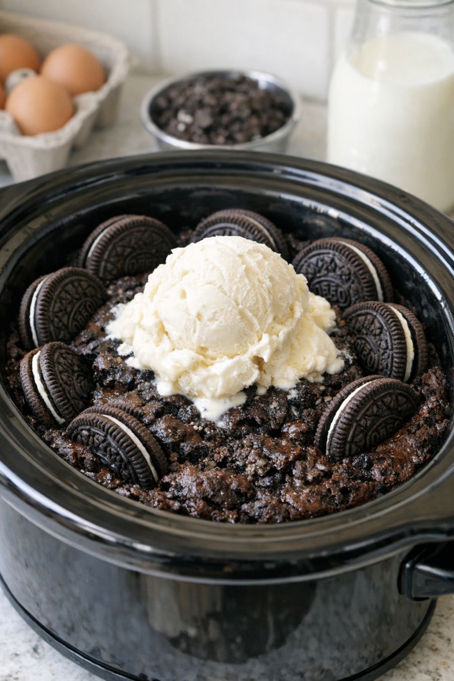 If you want to switch things up, try using vanilla or white cake mix instead of chocolate for a lighter, more classic cookies and cream flavor. You can also mix in 1/2 cup of chocolate chips or white chocolate chips into the batter before pouring it over the cookies for extra melty bits throughout. For a slightly less sweet version, use 1 cup milk plus 1/2 cup water instead of all milk. If you’re prepping ahead, you can layer the cookies in the slow cooker and whisk the dry cake mix with the milk in the morning, then store the batter covered in the fridge until you’re ready to cook; just give it a quick stir before pouring. Leftovers reheat well in the microwave in 20–30 second bursts and are great with a splash of milk poured over the top like a warm brownie sundae. You can also experiment with different cream-filled sandwich cookie flavors—mint, peanut butter, or seasonal varieties all work—just keep them whole and cream-filled so the texture stays true to the original idea.