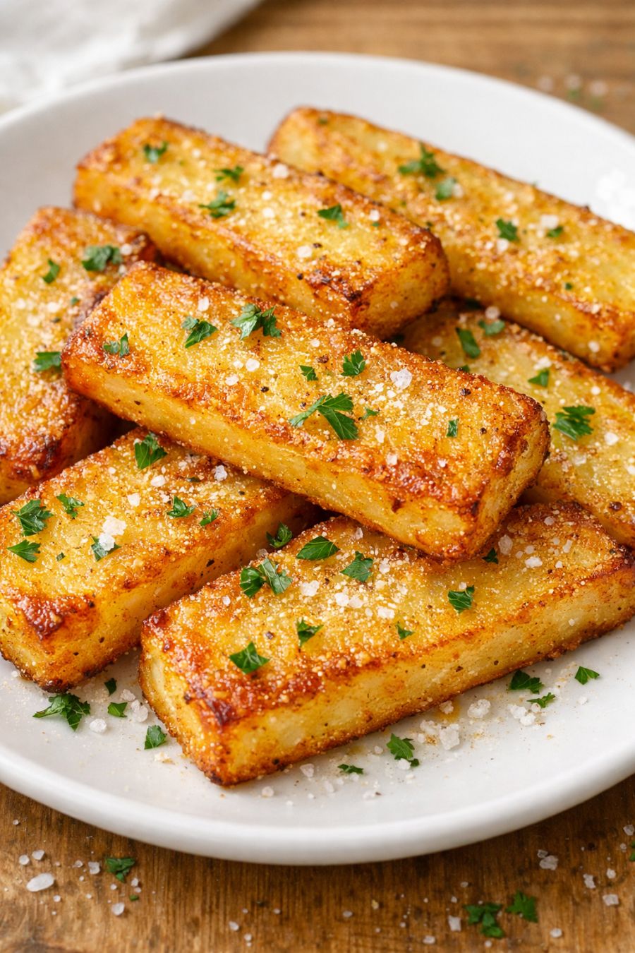 For a more herb-forward version that still respects the simplicity of the original, swap the garlic powder for 1/2 teaspoon of dried thyme or dried rosemary, or use a mix of dried herbs you already have on hand. If you’d like a smoked note, replace part of the black pepper with 1/4 teaspoon of smoked paprika. To echo older Midwestern tables, you can finish the hot potato planks with a small pat of butter dotted over the top right after baking; it will melt and add richness without changing the core 5-ingredient structure if you treat it as an optional flourish. For crispier results, avoid stacking or overlapping the planks; if your baking sheet is small, cook in two batches rather than crowding. Food safety tips: Always wash and dry your potatoes before peeling to remove surface dirt, and use a sharp knife and stable cutting board when slicing into planks to prevent slipping. Do not soak the potatoes for long periods at room temperature; if you need to hold them in water, keep the bowl in the refrigerator and dry the planks well before tossing with oil so they roast instead of steaming. Leftovers should be cooled quickly, stored in a covered container in the refrigerator, and eaten within 3 to 4 days; reheat on a hot baking sheet to restore some crispness.