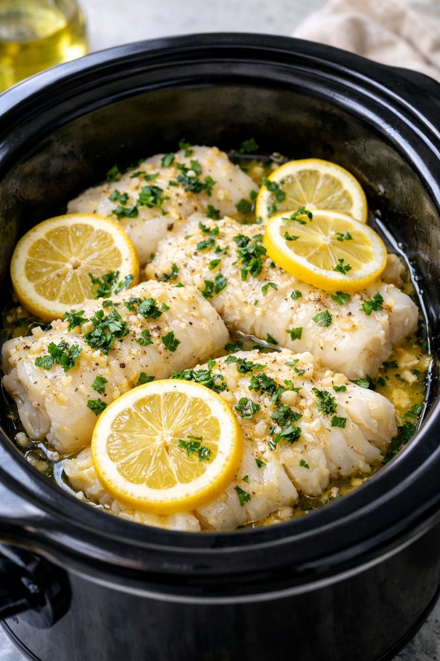 Once the cod is cooked through, gently spoon some of the buttery lemon-garlic sauce from the bottom of the slow cooker over the top of the fish. Taste the sauce and add a pinch of salt and pepper if desired (optional fifth and sixth ingredients, not required).