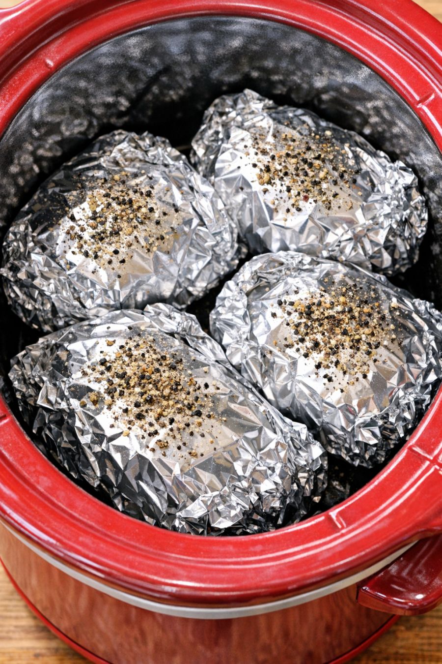 Place the foil packets seam-side up in the bottom of a 5- to 6-quart slow cooker, arranging them in a single layer as best you can. If needed, you can lean one or two packets slightly on top of the others, but avoid smashing them.