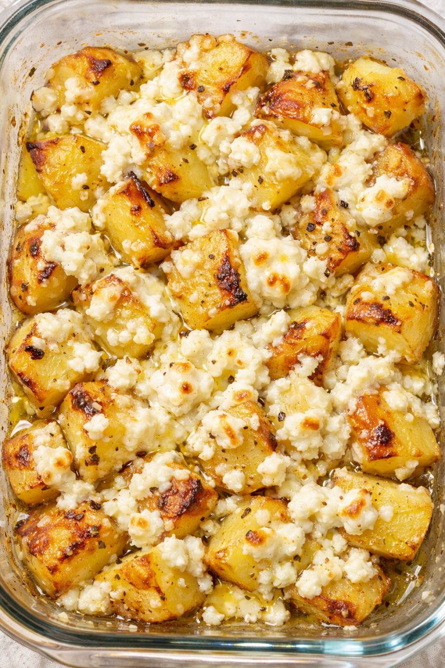 Sprinkle the crumbled or cubed feta cheese evenly over the top of the hot potatoes, making sure most of the pieces land on the potatoes rather than the bare glass so they soften and melt into the nooks and crannies.
