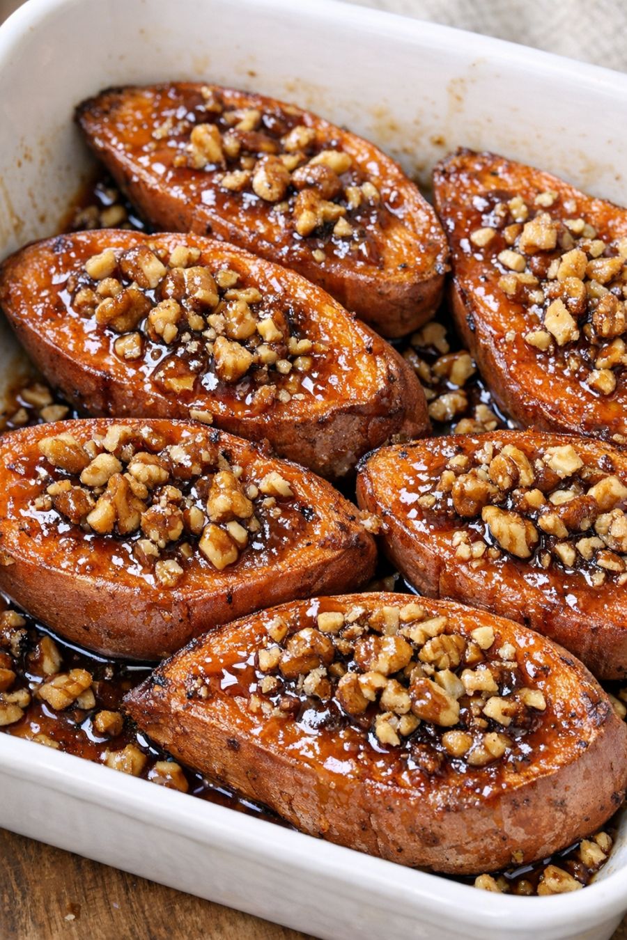 Rest and serve: Let the sweet potatoes sit for about 5–10 minutes after coming out of the oven. The glaze will thicken as it cools slightly, turning into that shiny, sticky coating you see in the baking dish. Serve warm, scooping up plenty of the glazed walnuts with each portion.
