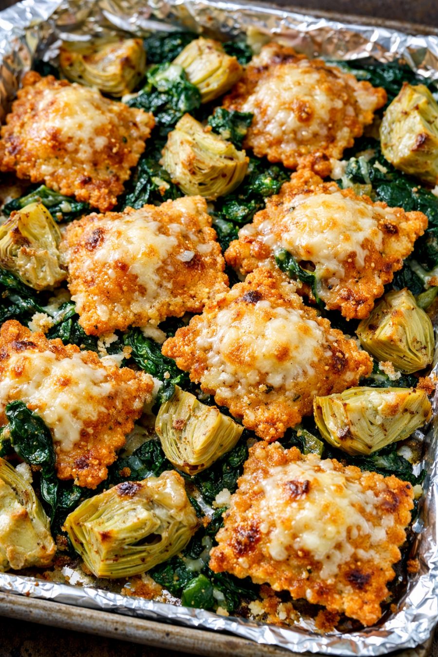 Use a spatula to gently loosen any ravioli that have stuck to the foil, then serve directly from the sheet pan, making sure to scoop up some crispy cheese, artichokes, and spinach with each portion.
