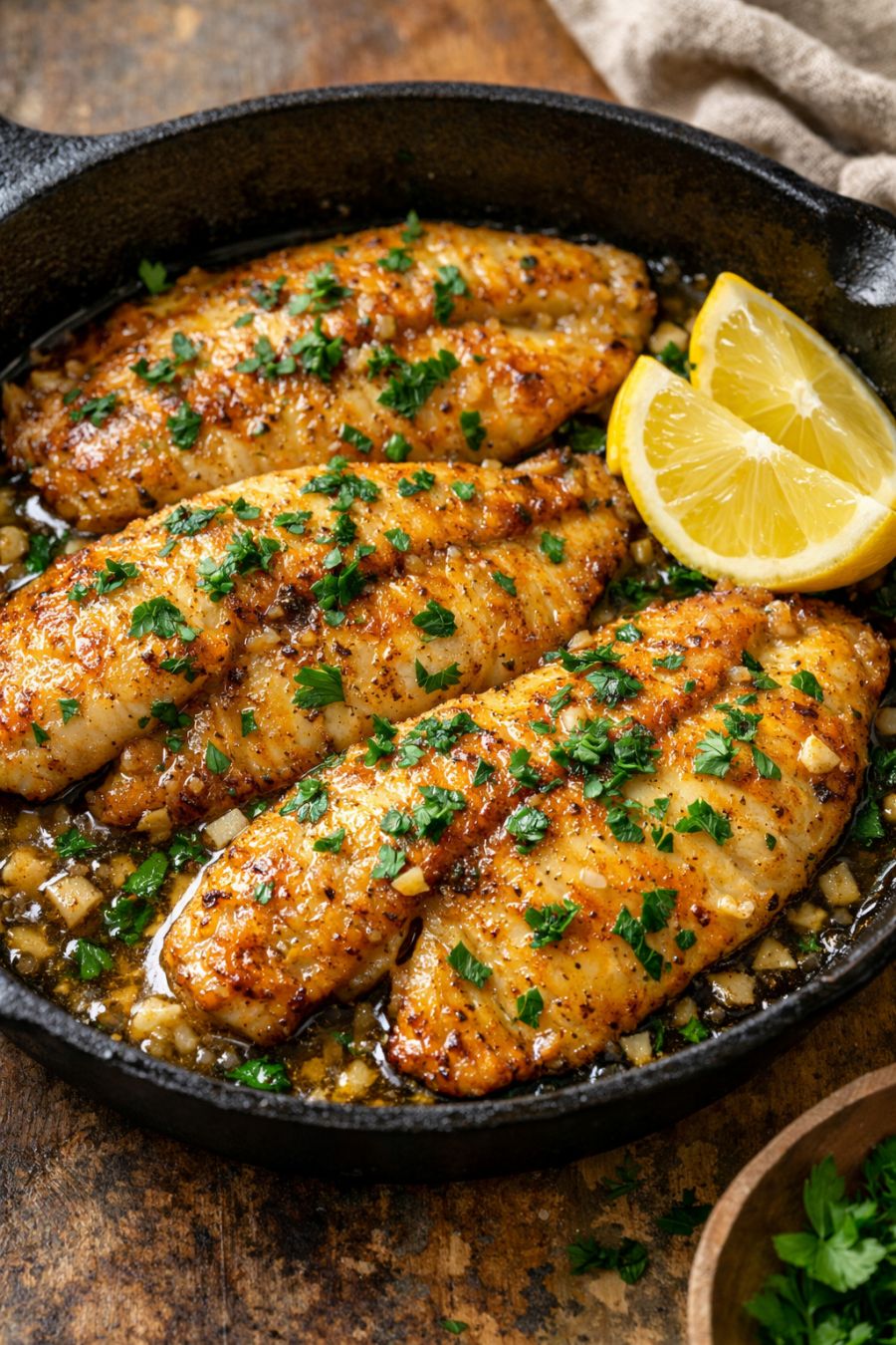 Serve the tilapia straight from the cast iron skillet, spooning the buttery, garlicky pan juices over each portion. Encourage everyone to drag their vegetables or sides through the remaining sauce in the pan—that’s where all the comforting flavor lives.
