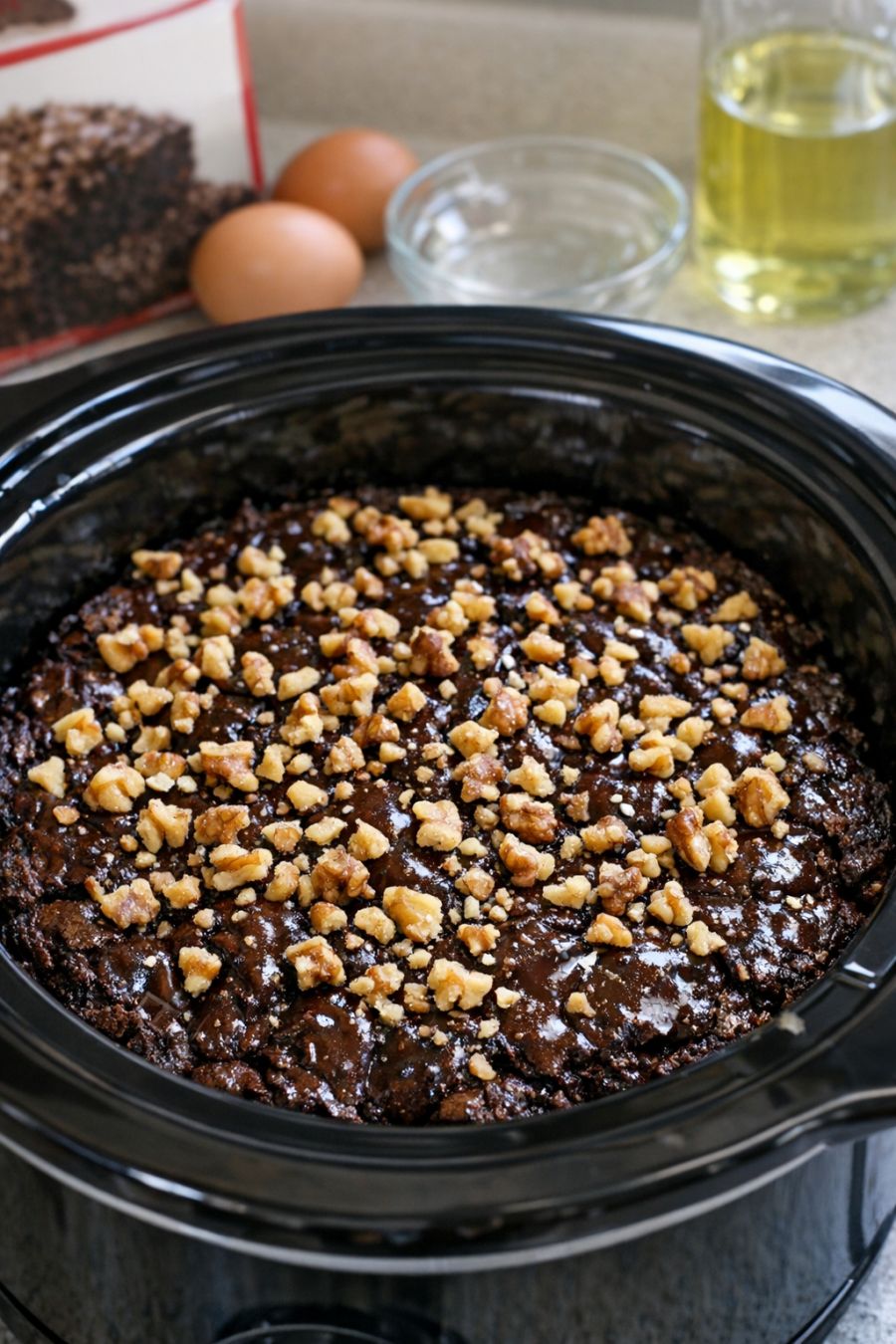 For extra chocolate flavor, stir 1/2 cup of chocolate chips into the batter before pouring it over the walnuts (this technically adds an ingredient, but it’s a fun upgrade when you’re not strict about the 5-ingredient rule). You can also swap in a flavored brownie mix, like one with chocolate chunks or espresso, to give the brownies a little twist without changing the method. If you prefer a more toasted walnut flavor, you can briefly toast the chopped walnuts in a dry skillet over medium heat for 3–4 minutes before adding them to the slow cooker, but the recipe is designed to work with raw roughly chopped walnuts as-is. For a slightly less rich version, replace half of the oil with plain Greek yogurt, knowing the texture will be a bit cakier. Food safety tips: Always cook the brownies on LOW until the center is set and eggs are fully cooked; undercooked batter with eggs can be unsafe. Use clean utensils and a clean slow cooker insert, and refrigerate leftovers within 2 hours of cooling. Store leftovers in an airtight container in the fridge for up to 4 days and rewarm individual portions in the microwave in short bursts.