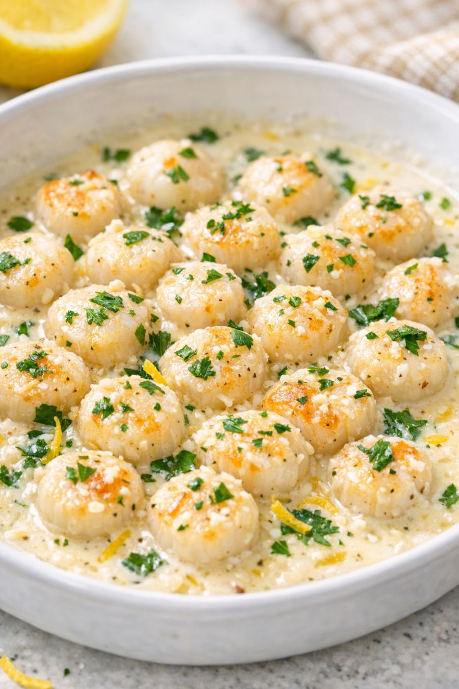 I like to ladle these creamy scallops over a bed of fluffy white rice or buttered egg noodles so all that garlicky Parmesan sauce has somewhere to soak in. A side of steamed green beans or peas keeps things simple and familiar, and a crisp green salad with a light vinaigrette balances the richness nicely. If you’re feeding a crowd, add warm dinner rolls or thick slices of buttered bread to mop up every last bit of sauce.