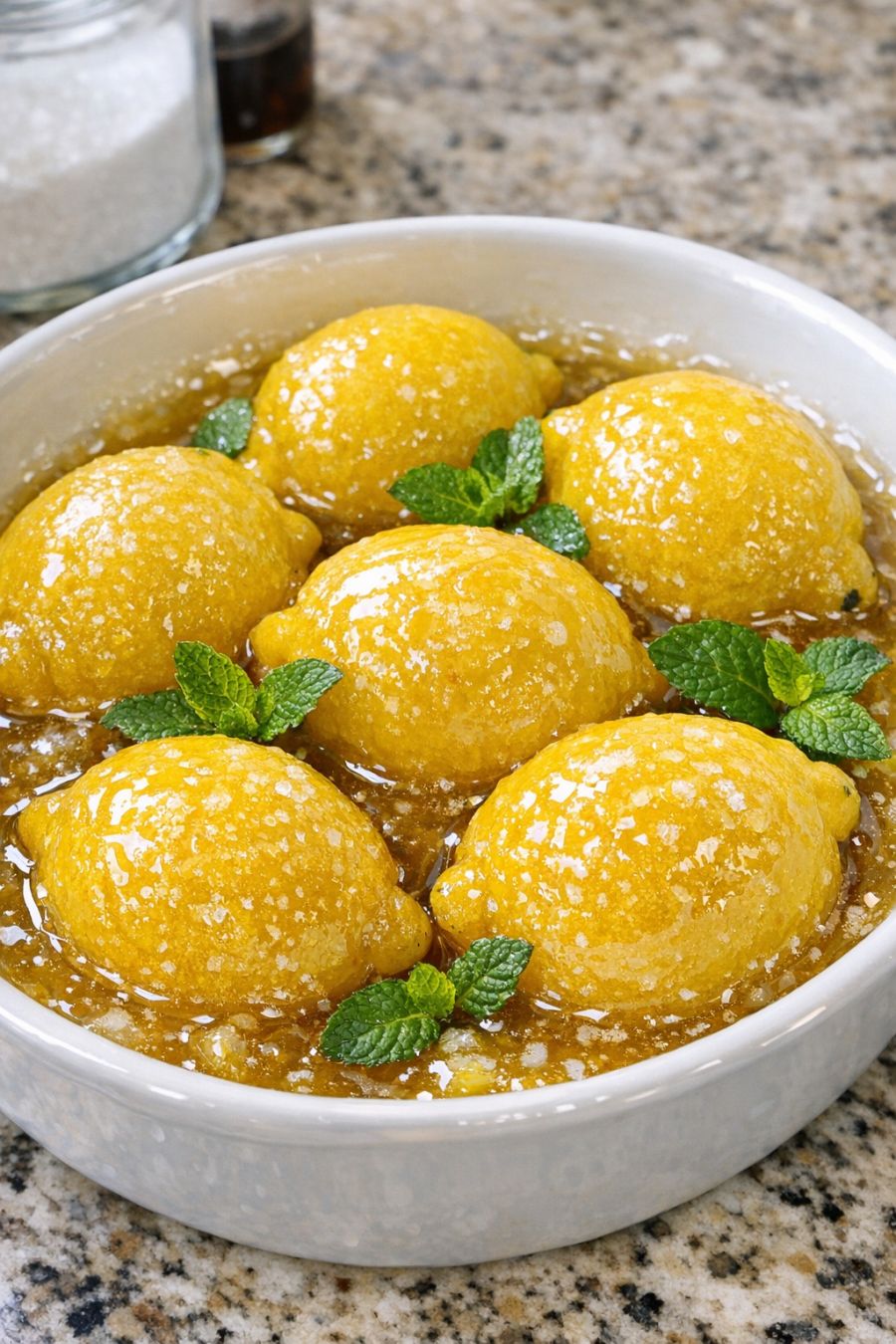 Let the lemons rest in the warm syrup, uncovered, for about 15–20 minutes to cool slightly and allow the flavors to settle.
