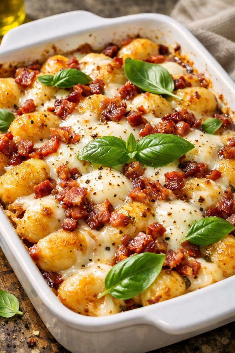 Once baked, remove the casserole from the oven and let it rest for 5–10 minutes. This short rest helps the sauce thicken slightly so it clings to the gnocchi instead of running all over the plate.