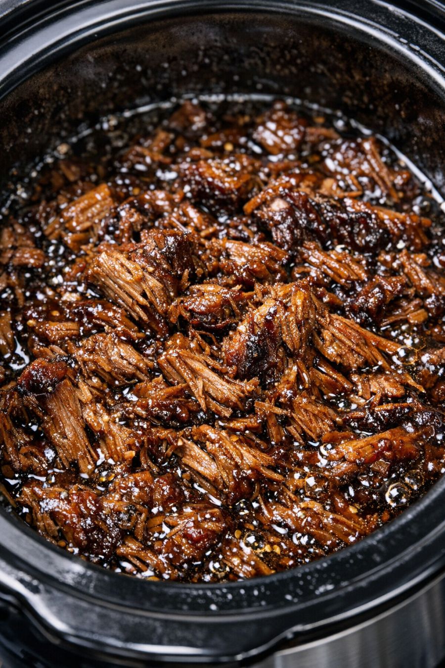 If the sauce seems a bit thin after shredding, leave the lid off and continue cooking on HIGH for 15 to 30 minutes, stirring a couple of times, until the liquid reduces to a thick, clinging glaze that coats the shredded meat and gently bubbles around the edges.
