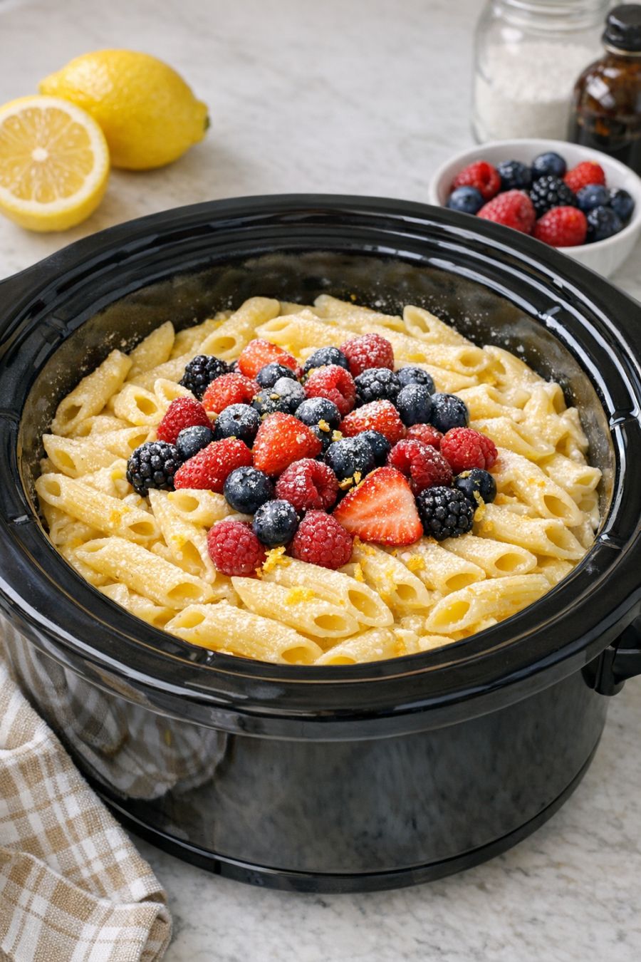 Serve this warm lemon-vanilla penne dessert straight from the slow cooker, scooped into small bowls. It’s lovely topped with fresh berries, a spoonful of whipped cream, or a little vanilla ice cream melting over the top. For a spring gathering, pair it with a simple fruit salad and coffee or iced tea. If you’re setting out a dessert table, this sits nicely next to bar cookies, lemon squares, or angel food cake to keep the flavors light and bright.