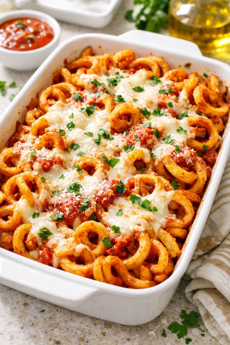 This 5-ingredient oven baked curly fries dish is my go-to on nights when I walk in the door hungry, tired, and absolutely not in the mood to fuss with dinner. You literally toss frozen curly fries into a baking dish, cover them in a thick, zesty red sauce and a few pantry staples, and let the oven do all the work. It’s like a cozy, Midwest-style mash-up of loaded fries and a quick casserole—simple, comforting, and guaranteed to have your husband (or whoever you’re feeding) going back for seconds.