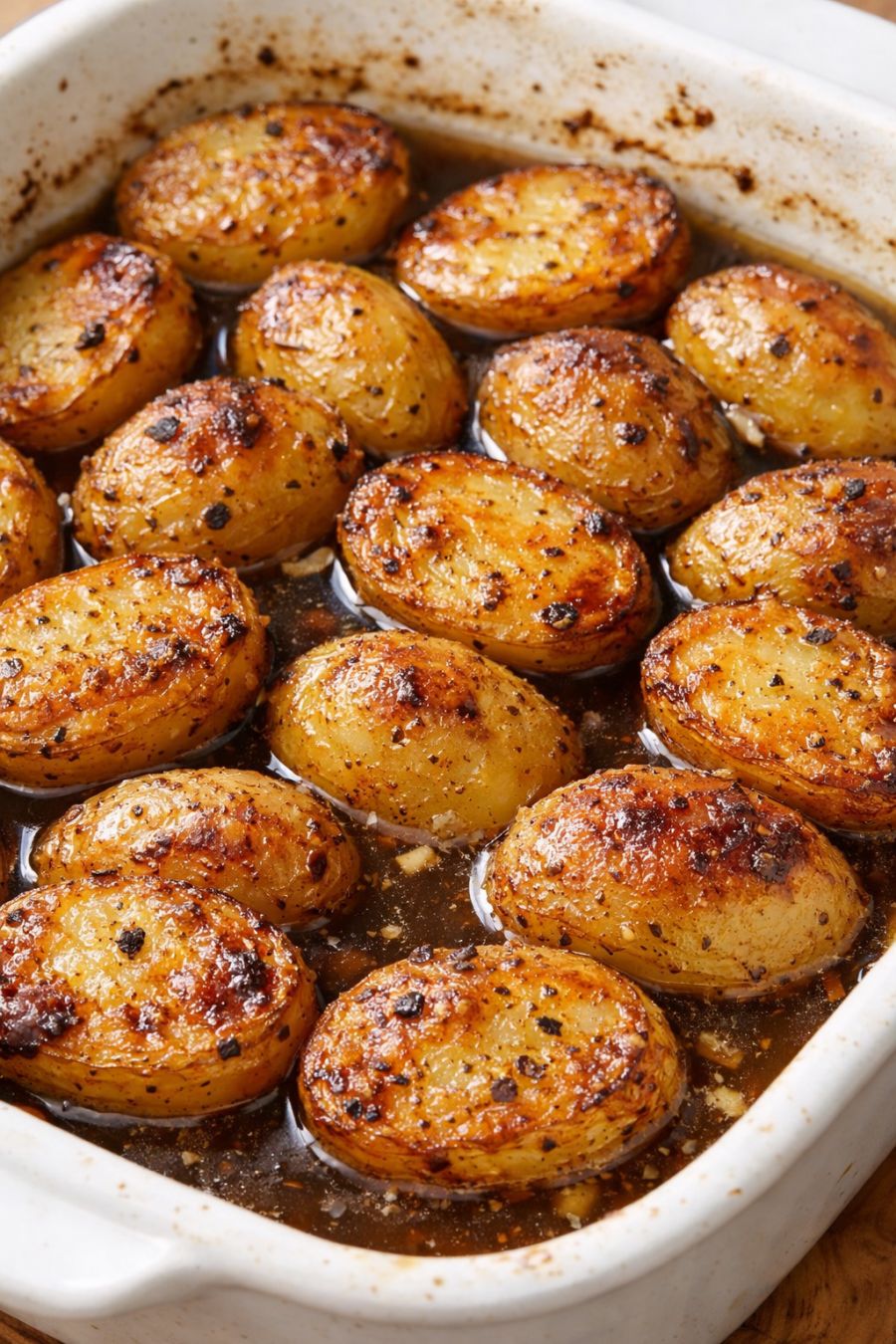 Arrange the potato halves in a single, snug layer in the ceramic baking dish, cut-side down. It’s fine if they touch; you want them cozy so they soak in the broth together.