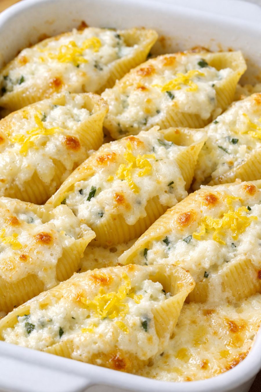 Take the dish out of the oven and let the shells rest for about 5–10 minutes so the sauce thickens slightly and the filling sets. Just before serving, grate or sprinkle a little extra lemon zest over the top for a bright pop of color and fresh flavor, then scoop the shells out with a large spoon and serve warm.