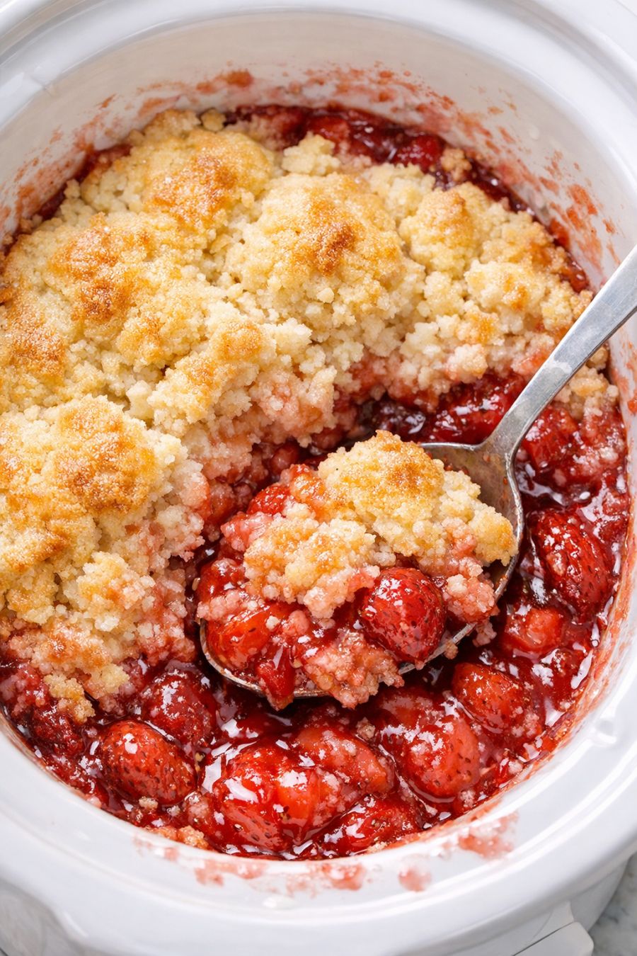 Cover the slow cooker with the lid. Cook on HIGH for 2 to 2 1/2 hours, or on LOW for 3 1/2 to 4 hours, until the strawberry filling is thick and bubbly around the edges and the topping is set, puffed, and golden in spots. Avoid lifting the lid in the first 1 1/2 hours so the topping can set properly.