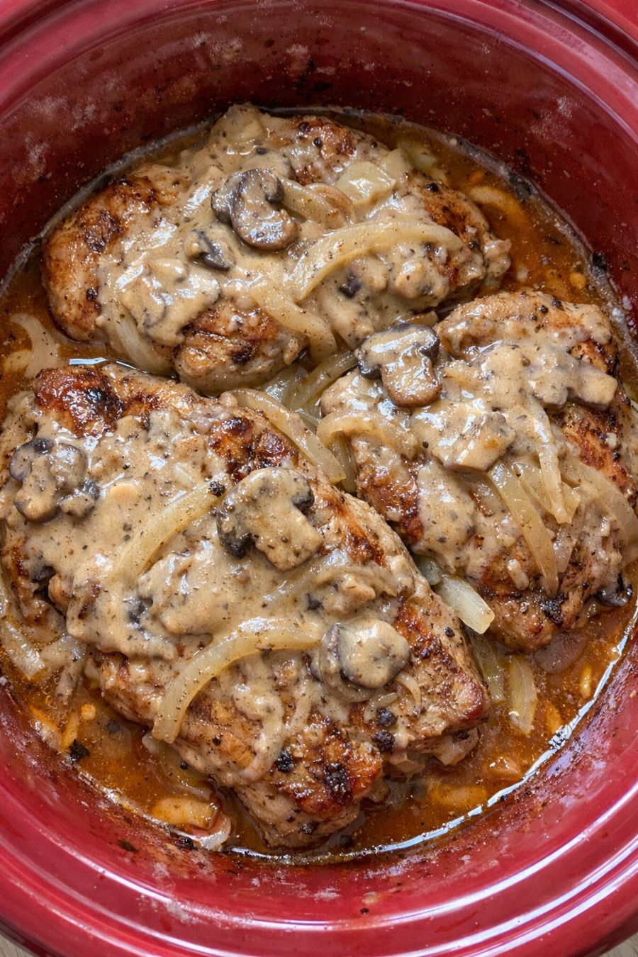 Serve: Transfer the pork steaks to a serving platter or serve directly from the slow cooker. Spoon plenty of the mushroom-onion gravy over the top of each portion. The meat will be very tender, so use a wide spatula or tongs to keep the steaks mostly intact as you move them.