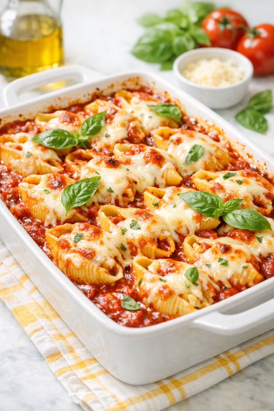 Let the pasta bake rest on the counter for about 5–10 minutes before serving so it can set up a bit and won’t burn anyone’s mouth. Scoop the shells and plenty of sauce into bowls or onto plates and serve warm.