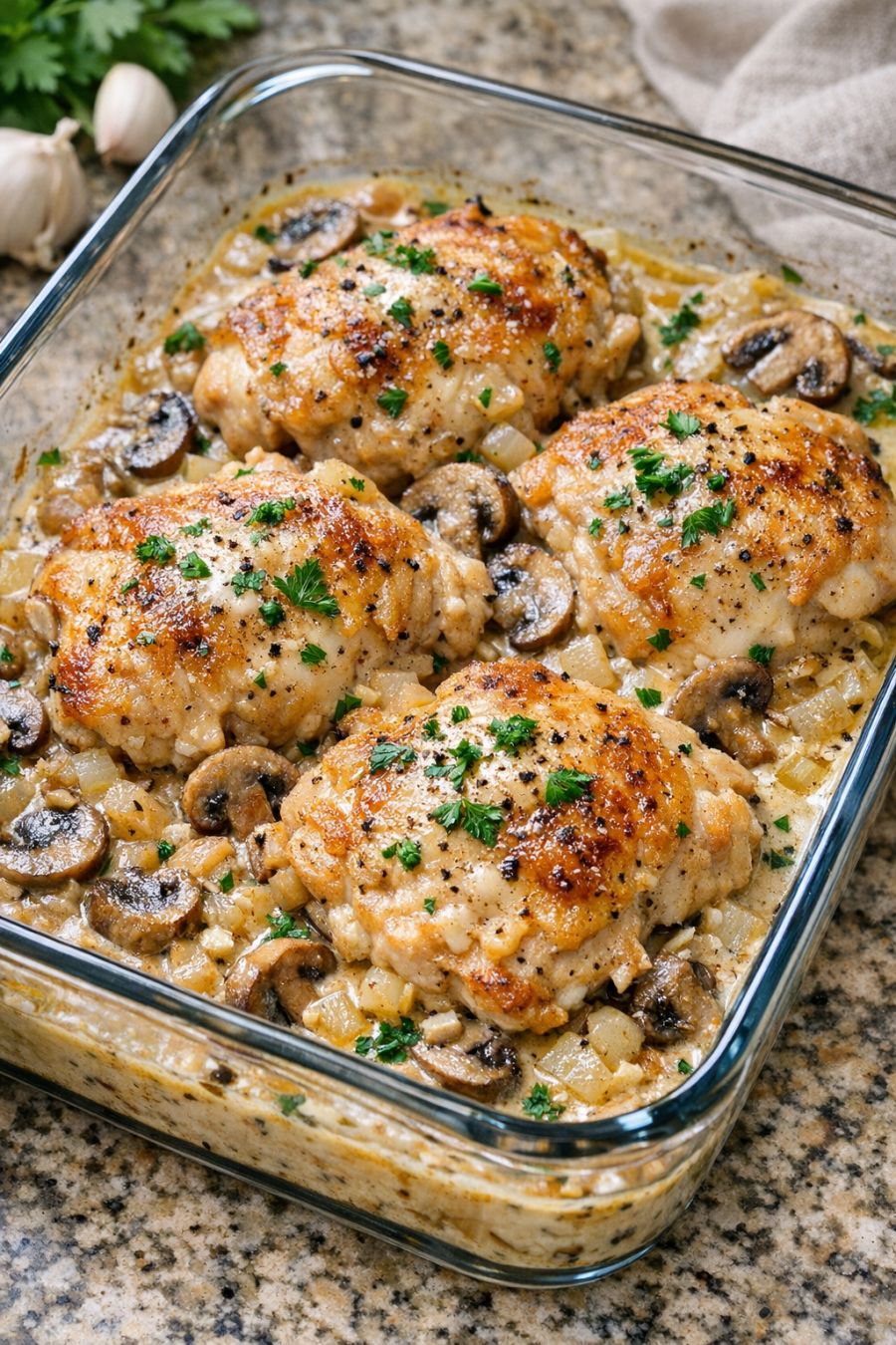 This oven baked 5-ingredient creamy mushroom chicken is one of those throw-it-in-the-dish, walk-away, and come-back-to-comfort kind of dinners. On especially busy workdays, I rely on recipes like this: you literally pour a can of cream of mushroom soup and four pantry-friendly ingredients right over raw chicken thighs in a baking dish, then let the oven do its thing. The result is tender, juicy chicken in a rich, savory mushroom sauce that tastes like you fussed a lot more than you did. It’s very Midwest potluck in spirit—simple, cozy, and the kind of meal people always circle back to for seconds.
