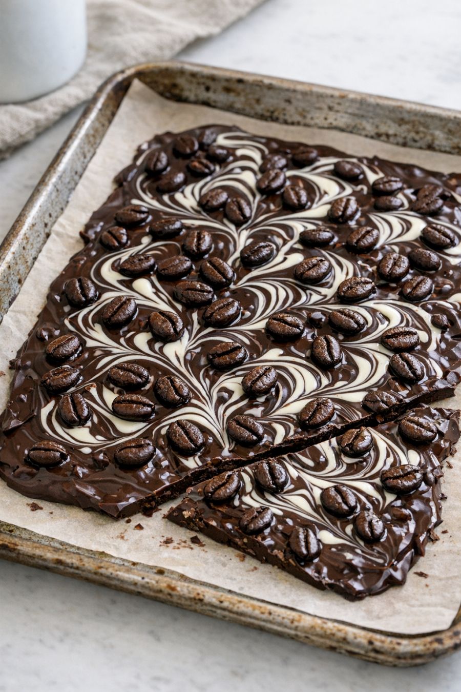 Line a baking sheet or large rimmed tray with parchment paper. Carefully spoon or pour the warm chocolate-espresso mixture onto the parchment. Use the spatula to spread it out into an even layer about 1/4 inch thick, nudging the beans so they’re fairly evenly spaced throughout.