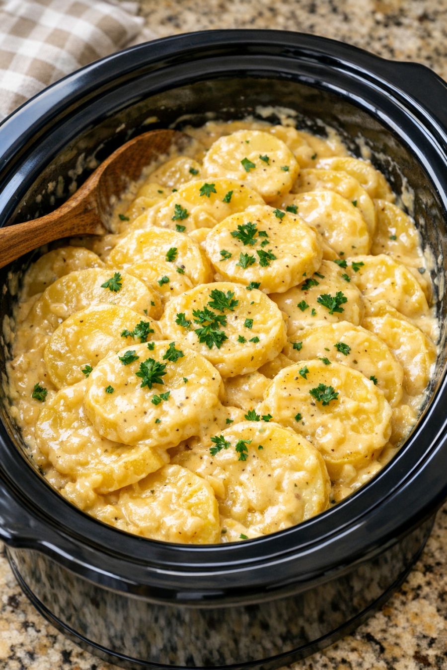 Once the potatoes are fork-tender and the sauce is creamy and slightly thickened, turn the slow cooker to WARM until you’re ready to serve. Gently scoop from the bottom with a large spoon or spatula to get both the tender potato slices and plenty of sauce in each serving.