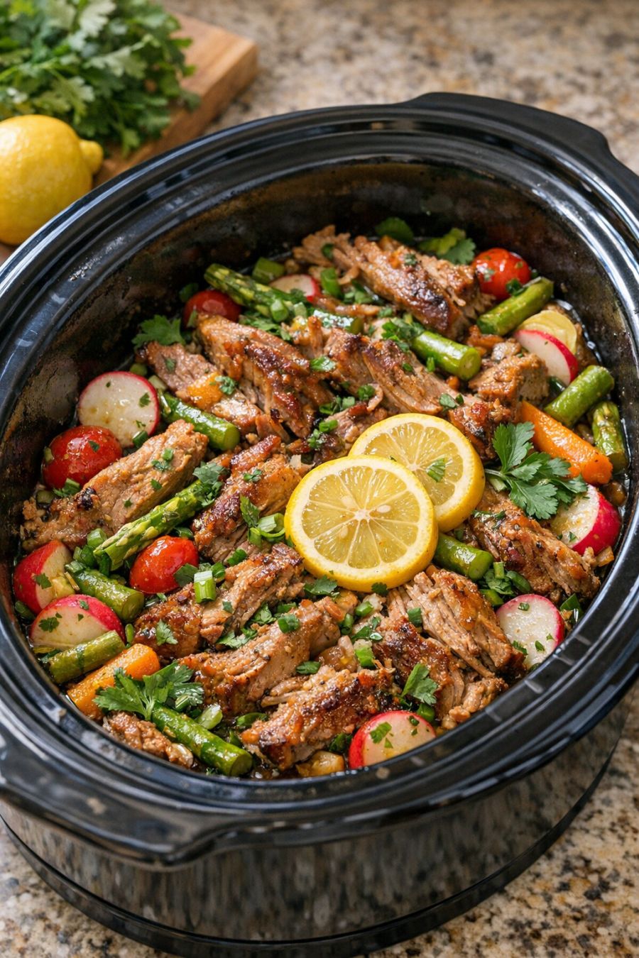 This 5-ingredient slow cooker spring pork is exactly what I reach for on those busy weeks when work runs late, the kids have activities, and I still want something that tastes like I actually tried. You literally toss frozen raw pork carnitas strips into the crock with four bright, simple ingredients, flip the switch, and let the slow cooker do its thing. The result is tender, juicy pork with light spring flavors from lemon, herbs, and veggies—comfort food that doesn’t feel heavy. It’s a Midwest weeknight hero: minimal prep, family-friendly, and perfect for using those frozen carnitas strips hiding in the freezer.