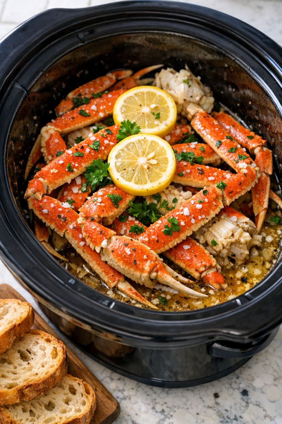 Serve these slow cooker crab legs right in the crock or transfer them to a big warmed platter. They’re wonderful with crusty bread or soft dinner rolls to soak up the buttery lemon broth. Add a simple green salad or a pan of roasted vegetables if you want more color on the table. Boiled or mashed potatoes, buttered noodles, or plain white rice all work nicely to stretch the meal a bit further. A few lemon wedges and a sprinkle of chopped parsley (if you have it) make things look company-ready, even if it’s just a Tuesday night at home.