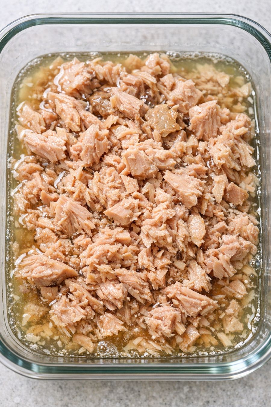 Dump wet, undrained canned tuna in the glass baking dish and 4 simple additions to get a dinner so savory your husband will be begging for it every week.